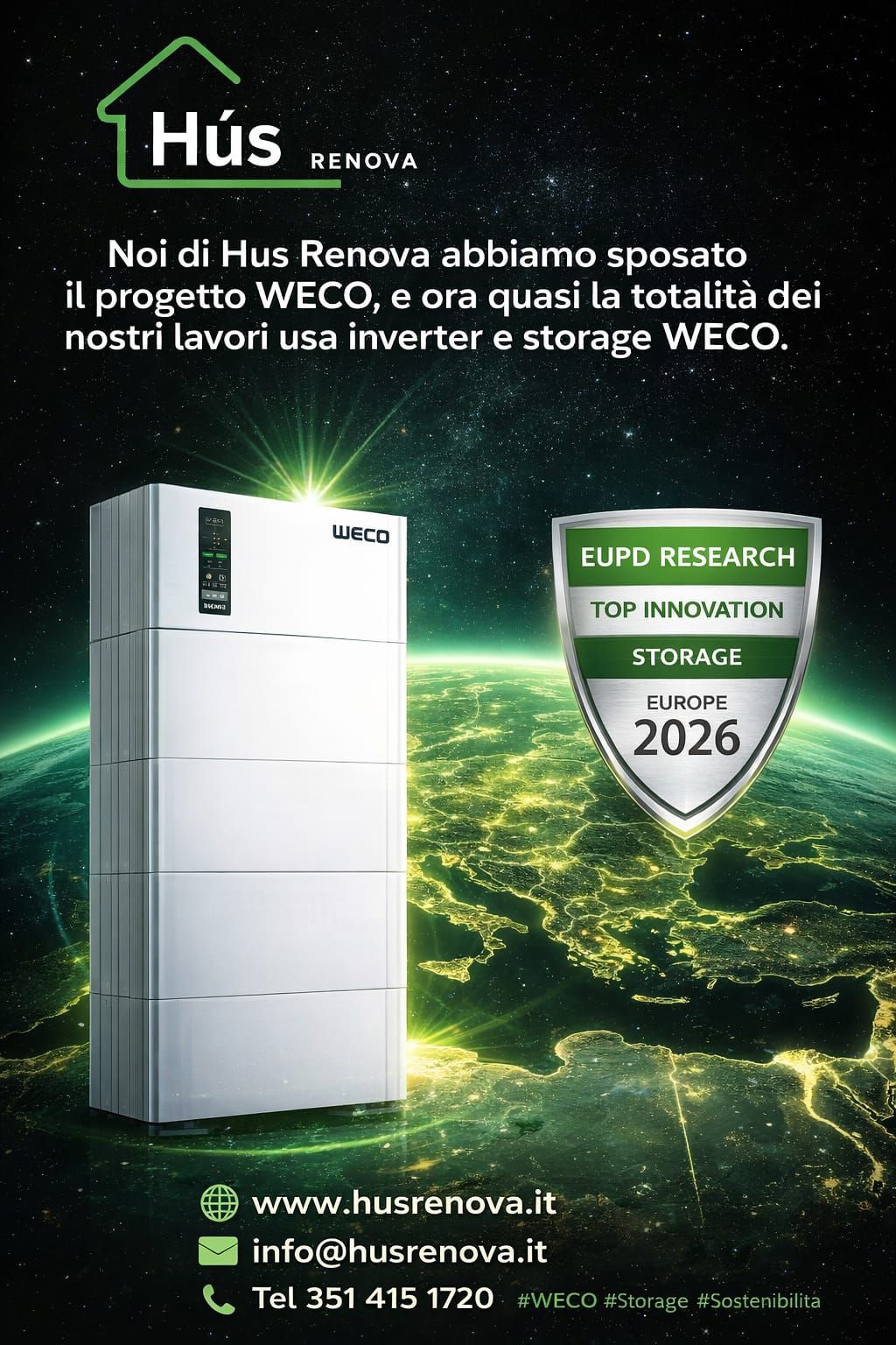 🏆 WECO premiata “Top Innovation Europe 2026 – Storage”Un riconoscimento che conferma l’eccellenza tecnologica e l’innovazione nel settore dell’accumulo energetico.Noi di Hus Renova abbiamo scelto di sposare il progetto WECO perché crediamo nella qualità, nell’affidabilità e nella visione sostenibile del brand. Oggi quasi la totalità dei nostri impianti utilizza inverter e sistemi di storage WECO, garantendo ai nostri clienti performance elevate e massima efficienza.Innovazione certificata. Partnership solida. Energia che guarda al futuro. ⚡